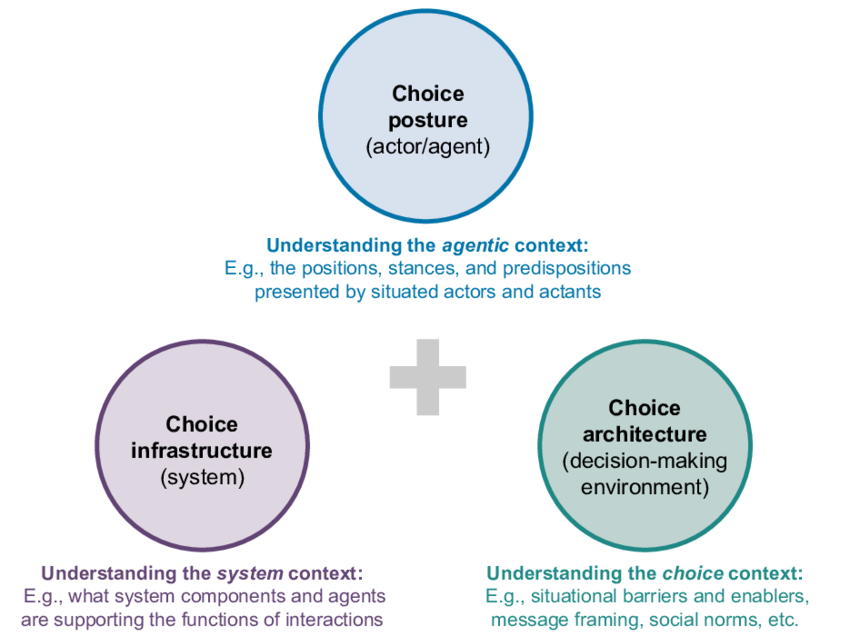 The first element is choice architecture, traditionally the domain of applied behavioral science, and it focuses on the design of the immediate context in which a decision is made to influence a specific behavior. Schmidt expands her model with the addition of Choice infrastructure and Choice posture.